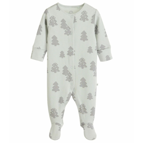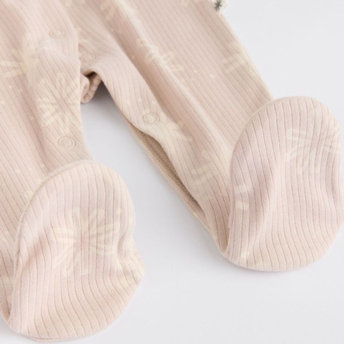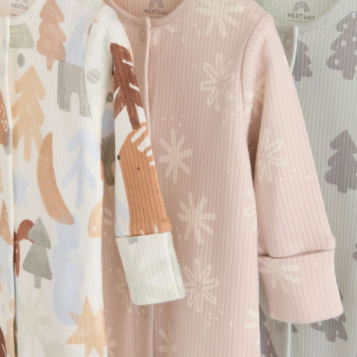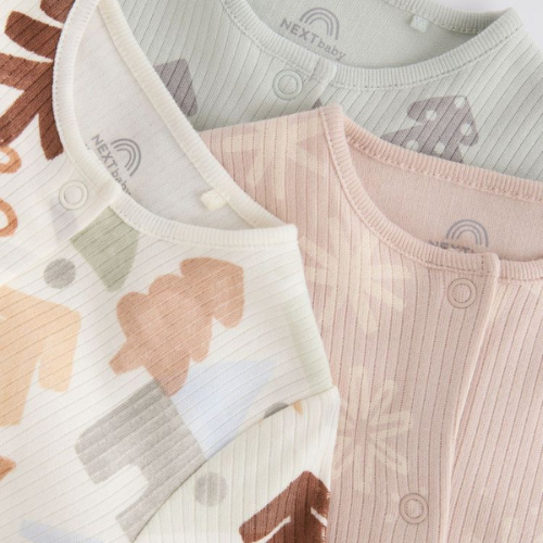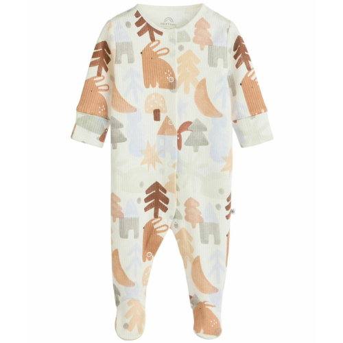 A stylish 3-pack of soft, ribbed footie rompers featuring charming abstract woodland and tree prints in soothing neutral and pastel shades. Essential comfort for babies in sizes 0-3 Months and 9-12 Months.