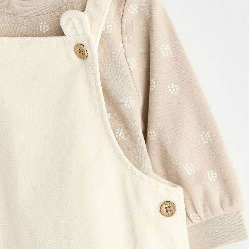 An utterly charming 2-piece set for babies aged 6-9Â months, featuring a Cream Corduroy Dungaree with adorable teddy ear straps and a neutral dot-print long-sleeve top. Soft, cozy, and perfect for stylish everyday wear or special occasion photoshoots.