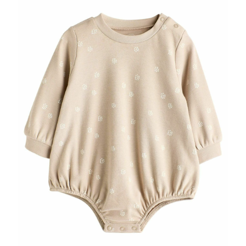 Printed Top: A neutral, long-sleeved top in a complementary beige/light brown hue, featuring a subtle, all-over dot pattern.