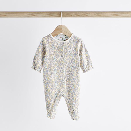 An elegant 3-pack of premium cotton footed sleepsuits, featuring delicate floral prints and a charming embroidered swan design. Essential comfort for babies aged 3-6 months.