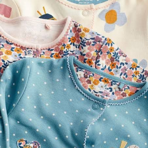 An enchanting 3-pack of footie rompers featuring delicate floral prints and cute appliques like apples and mushrooms. Essential comfort for babies sized Upto 1 Month.