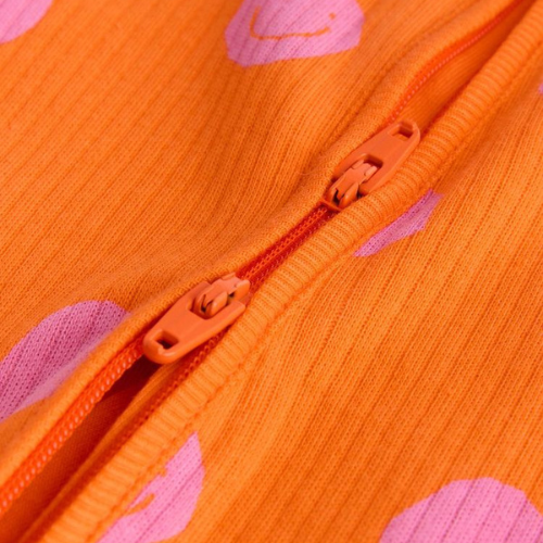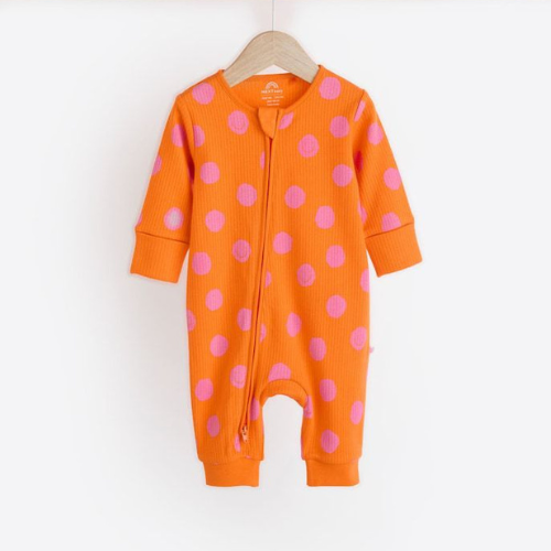 Make a bold statement with the Pop Art Bold Prints Ribbed Romper 3-Pack, designed for ultimate comfort and striking style in the 6-9 Months size range. This contemporary collection is ideal for babies who are sitting up and starting to move, ensuring they look great while staying comfortable. Each of the three rompers is crafted from a high-quality, soft ribbed cotton blend that provides gentle stretch, superior softness, and excellent breathability—perfect for active wear. The fabric’s texture adds a modern, on-trend feel. The set showcases three distinct, vibrant, and coordinating designs in a fun color-block style: one features a captivating blue and pink checkerboard pattern interspersed with tiny hearts, complete with a full-length zip closure; the second is a bright orange romper with bold pink polka dots, also featuring a zip closure; and the third is a lovely lavender ribbed romper with an all-over orange sunburst/star print, providing a visually engaging variety. Designed for parental convenience, all three rompers feature a full-length, easy-glide zipper running down the center front, enabling quick and hassle-free dressing and diaper changes. The zipper includes a protective fabric tab at the neck to prevent any irritation. The footless design offers versatility for this active age group, allowing the rompers to be paired with socks or soft shoes as needed. The contrast ribbed cuffs at the wrists and ankles ensure a secure, comfortable fit that stays in place during play. To maintain the vibrant colors and fabric integrity, machine wash the rompers inside out in cold water on a gentle cycle. Tumble dry on a low setting or air dry to preserve the ribbing and fabric softness. This 3-pack is a superb, fashion-forward collection from Ala Mode PK 2.