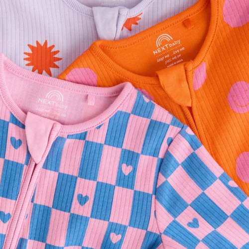 An electrifying 3-pack of ribbed zip-up rompers featuring vibrant checkerboard, polka dot, and starburst prints. Perfect for stylish babies sized 6-9 Months.