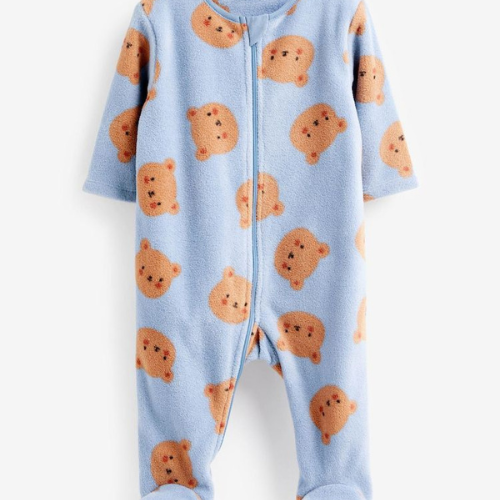 Bear Print Sleepsuit: Features a light Blue base with a charming, all-over pattern of cute, brown bear faces. This suit has a fun, playful look.