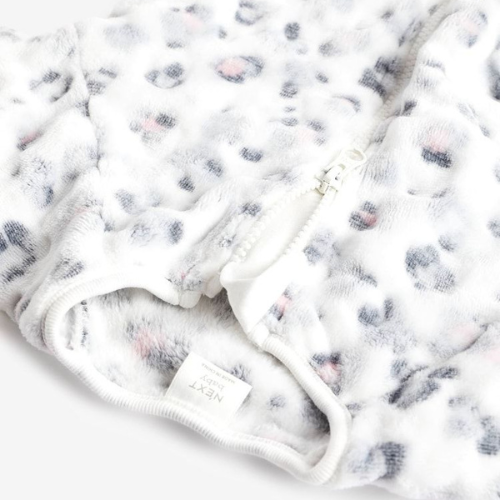 A plush and cozy footed sleepsuit made from soft fleece, featuring a fun grey, white, and pink leopard/animal print. Available in Newborn and 9-12 months, this full-zip romper is perfect for warm, stylish sleeping.