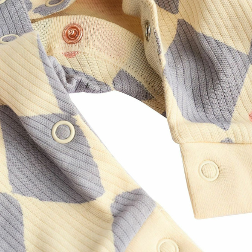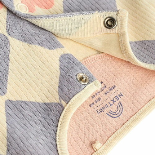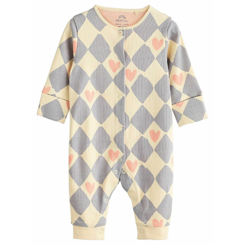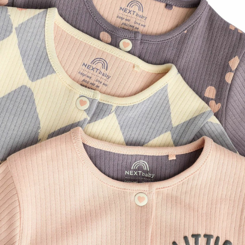 An adorable 3-pack of soft, ribbed rompers featuring cheerful heart and diamond patterns in sweet pastel shades. Essential daily comfort for babies sized 3-6 Months.