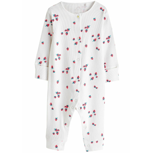 A practical and playful 3-pack of long-sleeve, footless jumpsuits featuring adorable strawberry, cherry, and orange prints on a soft ribbed fabric. Ideal for toddlers who need freedom to move and prefer footless styles. The full-length front snaps make dressing and nappy changes simple.