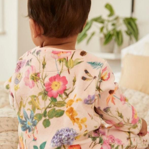 A plush and cozy all-in-one made from super soft teddy fleece, featuring a bright, colourful floral pattern on a navy background. Sized Up to 1 month, this full-zip romper is perfect for keeping newborns snug and stylish in cool weather.